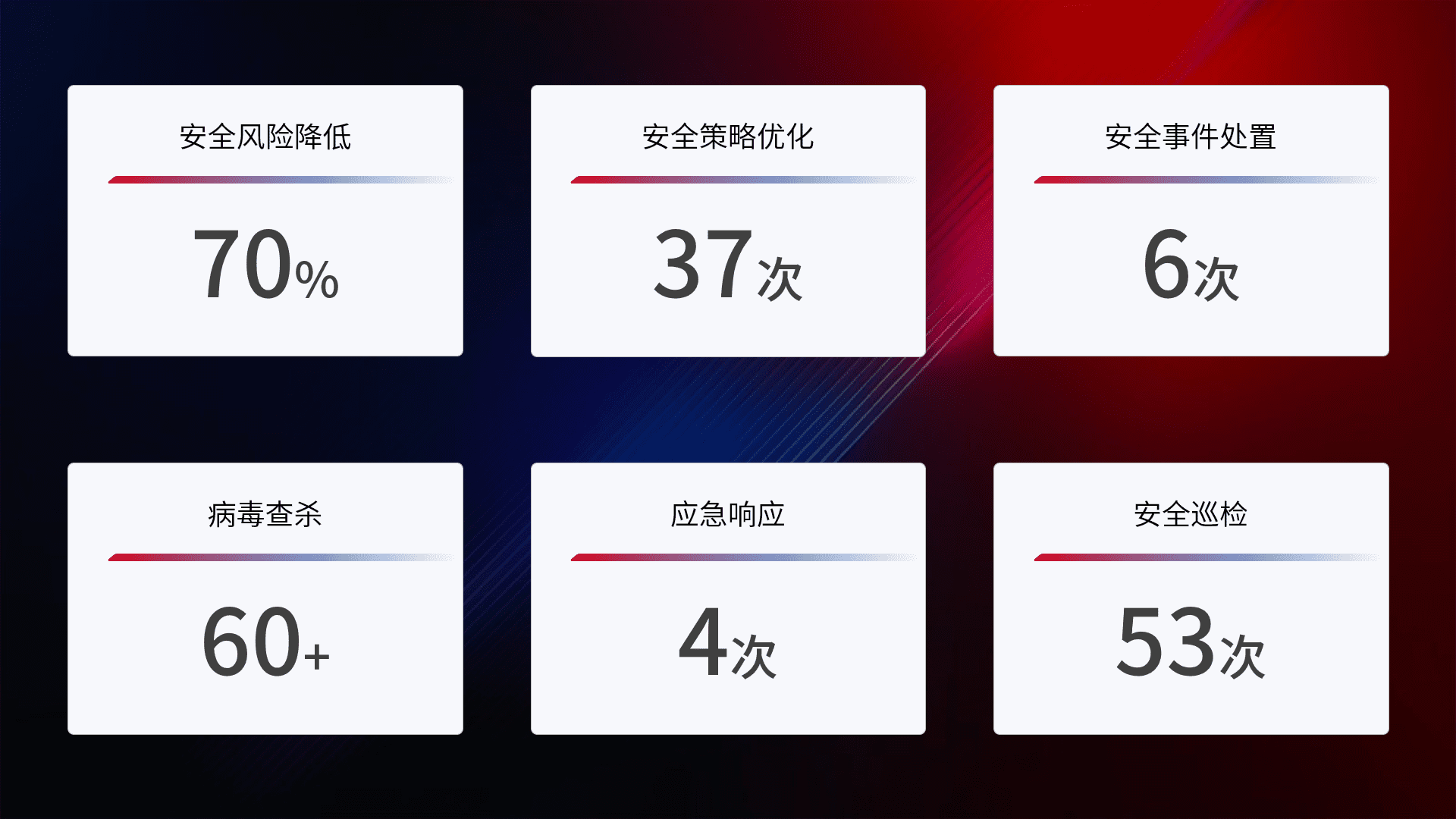 提供全面的安全事件报告体系,,包括处置报告、、、、周报、、季度和年度总结,,结合持续监控,,,,帮助客户深入了解网络安全状况。。